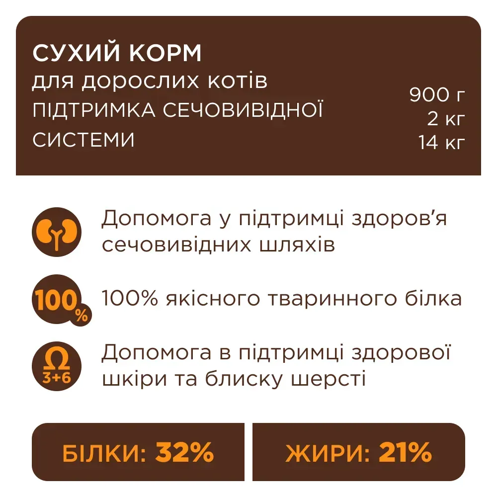 Раціон створений для дорослих котів, які потребують делікатної підтримки сечовидільної системи. Завдяки ретельно підібраним мінералам та високоякісному м’ясному білку з курки, цей корм не лише смачний, а й функціональний. Підходить для щоденного годування тварин віком від 1 року, у тому числі з підвищеною чутливістю до складу звичайних кормів.